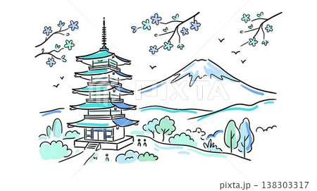 士山と五重塔に桜が咲き誇る日本の絶景