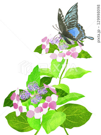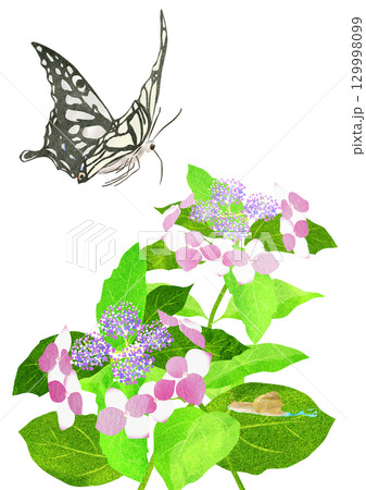 梅雨の晴れ間にアジサイに止まる蝶の切り絵貼り絵イラスト