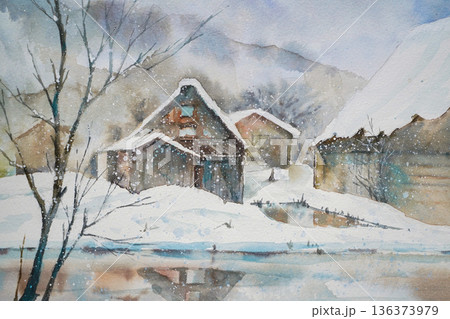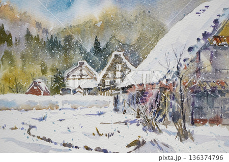 【世界遺産】豪雪の白川郷・三連合掌・水彩画調【岐阜県】
