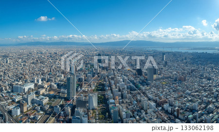 大阪の都市景観を1000mから俯瞰した空撮パノラマ 快晴の空が映えるダイナミックな都市の眺め