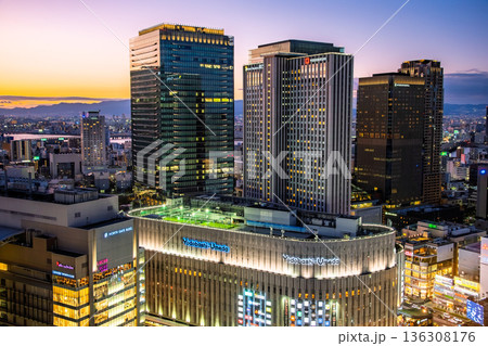 大阪・梅田 夕暮れのマジックアワーに輝くヨドバシ梅田タワーと高層ビル群