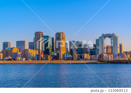 大阪梅田の西陽に染まる超高層ビル群と淀川