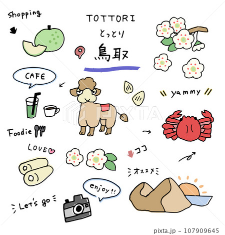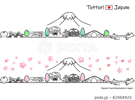 春の鳥取県の観光地のシンプル線画イラストマップ