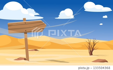 Wooden signpost in desert among rocks and sand. Wilderness landscape. Arid wild land. Arrow way plank pointer. Sandy dunes. Blank signboard. Directional guidepost. Vector nature background