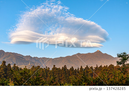 鹿児島 杉山公園付近より夕日に照らされた噴煙たなびく桜島を望む
