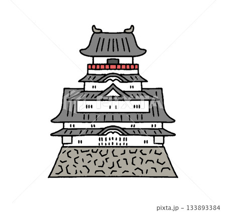 夏の九州の観光地の街並みと太陽のシンプル線画セット