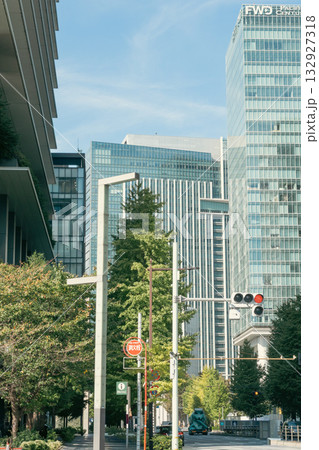 都市風景 巨大ビルに囲まれた東京を見上げる