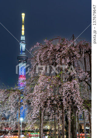 夜景「東京都」隅田公園 満開のしだれ桜 三春の滝桜の子孫樹
