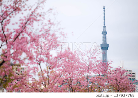 「東京都」東京スカイツリーと河津桜