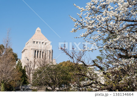 国会議事堂と八重桜が彩る春の永田町 日本の政治中枢に訪れた季節の風景