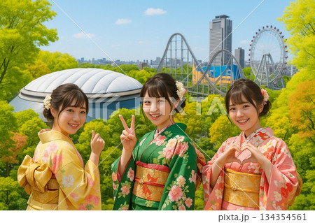 AI generated Pair of cheerful young females walk excitedly toward vividly decorated dome