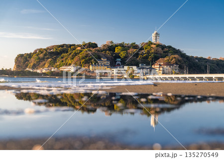 《神奈川県》夕暮れの江ノ島・片瀬海岸のビーチ