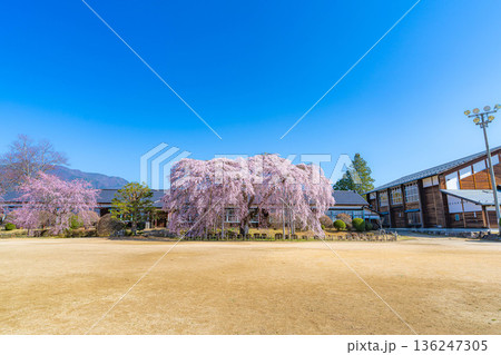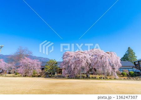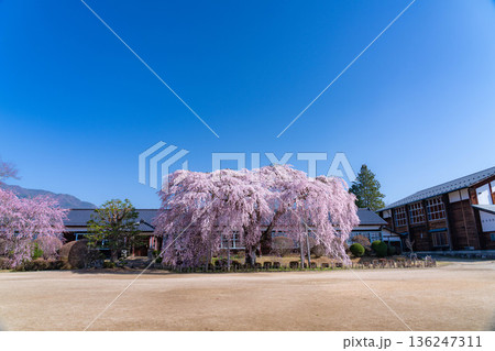 【南信州の桜】快晴の朝の杵原学校のしだれ桜【長野県】