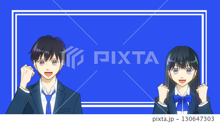 高校生または中学生の男女のアニメ風イラスト、スクールテイスト、カラー背景、コピースペースあり
