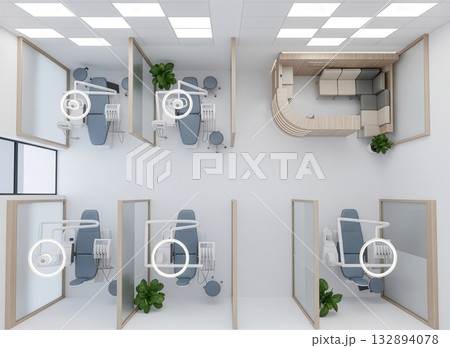 寒色、水色のモダンなデザインの歯医者さんの診察台・チェア、歯科診療ユニット、機材フルセット