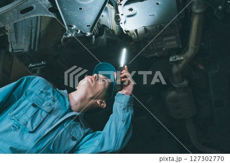 メカニッククリーパーに乗り車の下回りをチェックする自動車整備士の男性