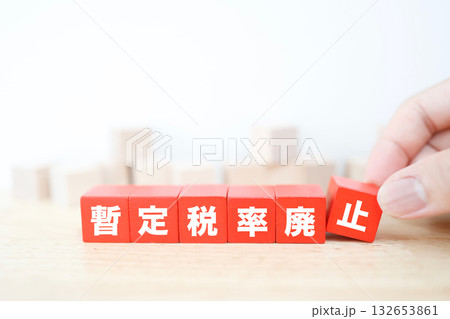 ガソリン暫定税率廃止を示す6個の赤ブロック。白背景にコピースペース。