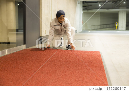 ビル清掃イメージ フロアのモップかけをする50代の女性清掃スタッフ