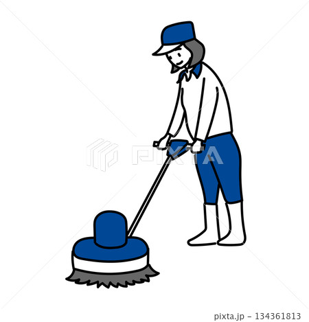 イラスト素材: 業務用ポリッシャーで床清掃する作業員のイラスト