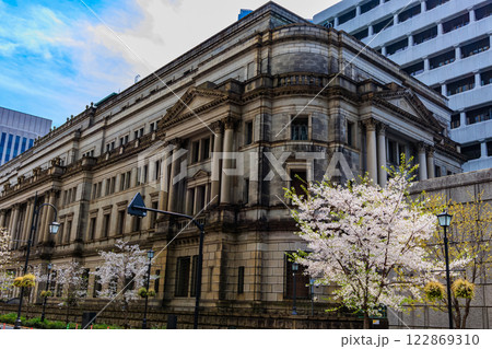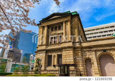 銀行の外観と看板の文字。金融機関や金利、預金をイメージする写真。