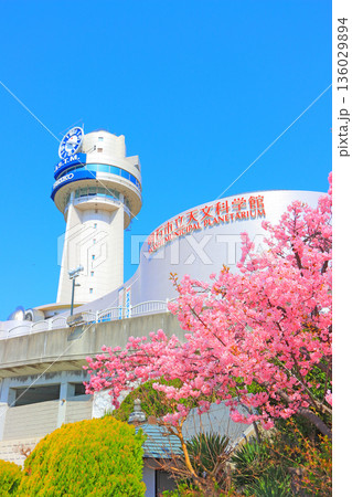 兵庫県明石市、明石市立天文科学館と河津桜の風景