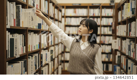 柔らかな光の図書室で本を手に取る女性