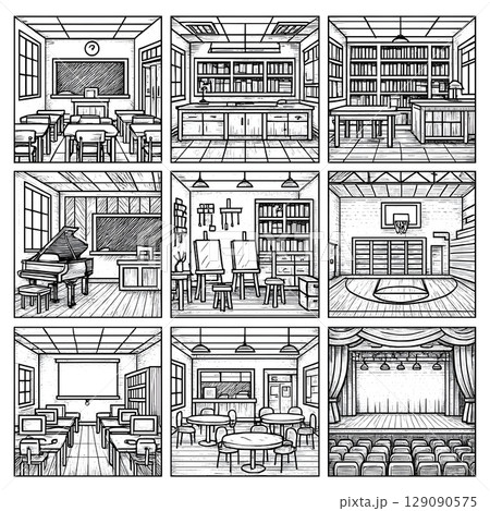 学校施設の詳細室内イラストセット(教室・図書室・体育館・音楽室など)