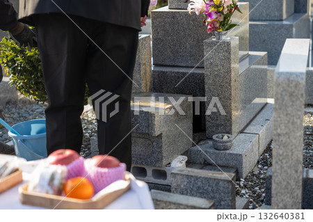 喪服を着て納骨のため墓地にたたずむ中高年男性