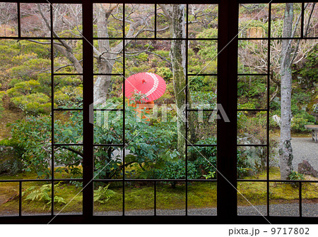 A person stands protected by an umbrella in a courtyard garden, Kyoto, Japan