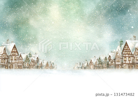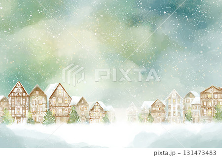 冬の街並みと雪景色のやさしい水彩風背景イラスト