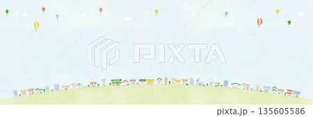 水彩風 かわいい街並みの背景イラスト素材 横長 コピースペース