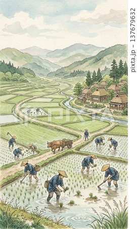 アニメ風に描かれた日本の山里と青空に映える壮大な山脈風景