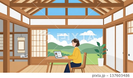 和風建築の屋内スペースを俯瞰で描いたアイソメトリックイラスト素材