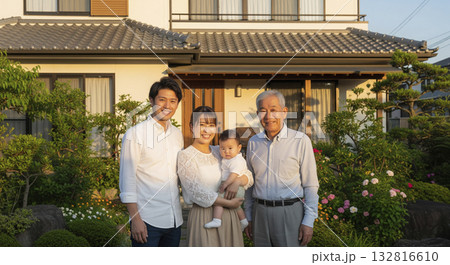 住宅の前で赤ちゃんを笑顔で囲む三世代家族の集合写真