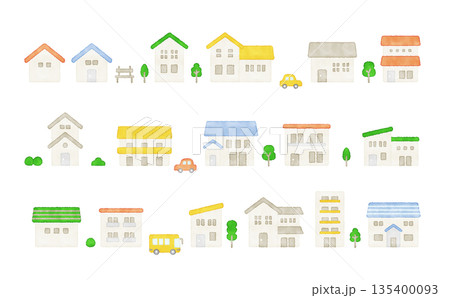 水彩風 かわいい家のアイコンセット|住宅・家屋 ベクター素材