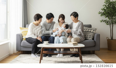 部屋で赤ちゃんを囲んで幸せそうな三世代家族の集合写真
