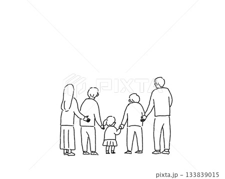 五人家族の後ろ姿、背中(祖父、祖母、夫婦、孫、娘)、線画