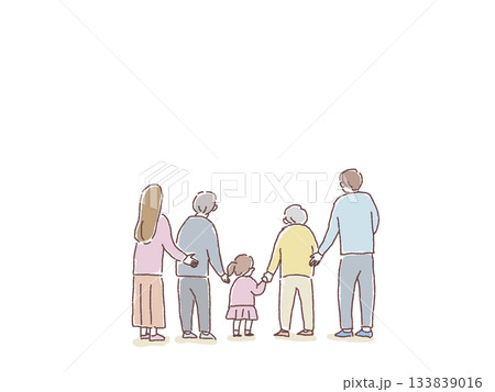 五人家族の後ろ姿、背中(祖父、祖母、夫婦、孫、娘)