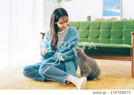 リビングで猫と遊ぶ女性