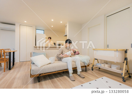 リビングでくつろぐ若い家族