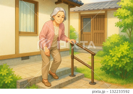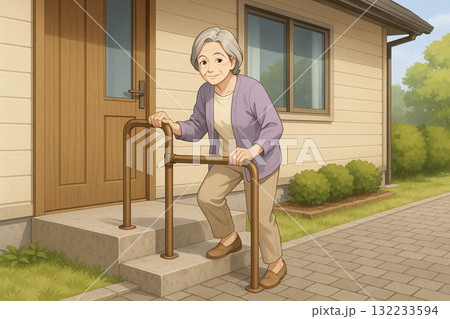 玄関の手摺付きベンチに腰掛けるおばあちゃん