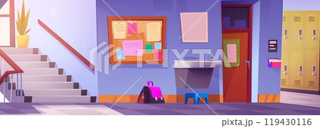Cartoon school corridor. College hallway with doors wardrobe, information boards. Entrance in education building, empty interior sapid vector scene