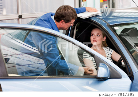Mechanic speaking to woman in car