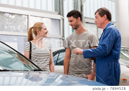 Mechanics talking to woman about car