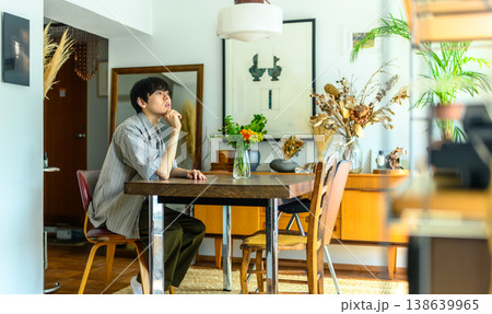 ダイニングで花を眺める若い男性