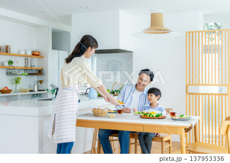 ダイニングで食事をする家族