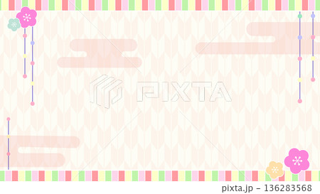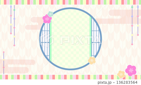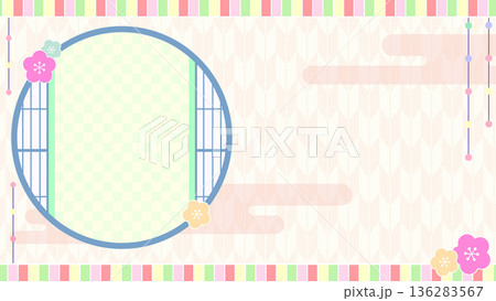 春のひな祭りの和風背景フレーム素材(桃の花・丸窓・矢絣・パステルカラー)