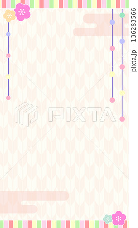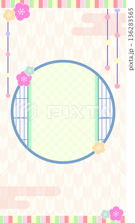 春のひな祭りの和風背景フレーム素材_縦型(桃の花・丸窓・矢絣・パステルカラー)