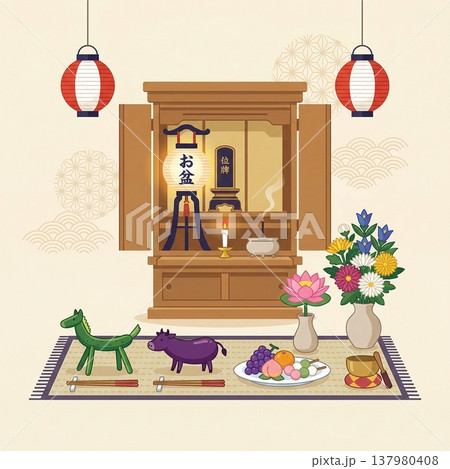お盆のお迎え 精霊棚のイラスト 主線なし