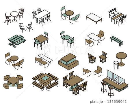 さまざまな種類のテーブルと椅子をまとめたイラスト素材セット